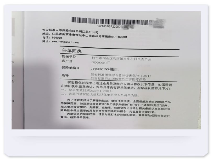 近日,恒安標準人壽將總計2214.3萬(wàn)保額的團體意外傷害保險和團體意外傷害醫療保險合同交到江蘇省徐州市銅山區利國鎮萬(wàn)莊村村委會(huì )手中,期待為村民們的美好生活保駕護航,也希望以本次捐贈為契機,進(jìn)一步推動(dòng)公司社會(huì )責任的履行。